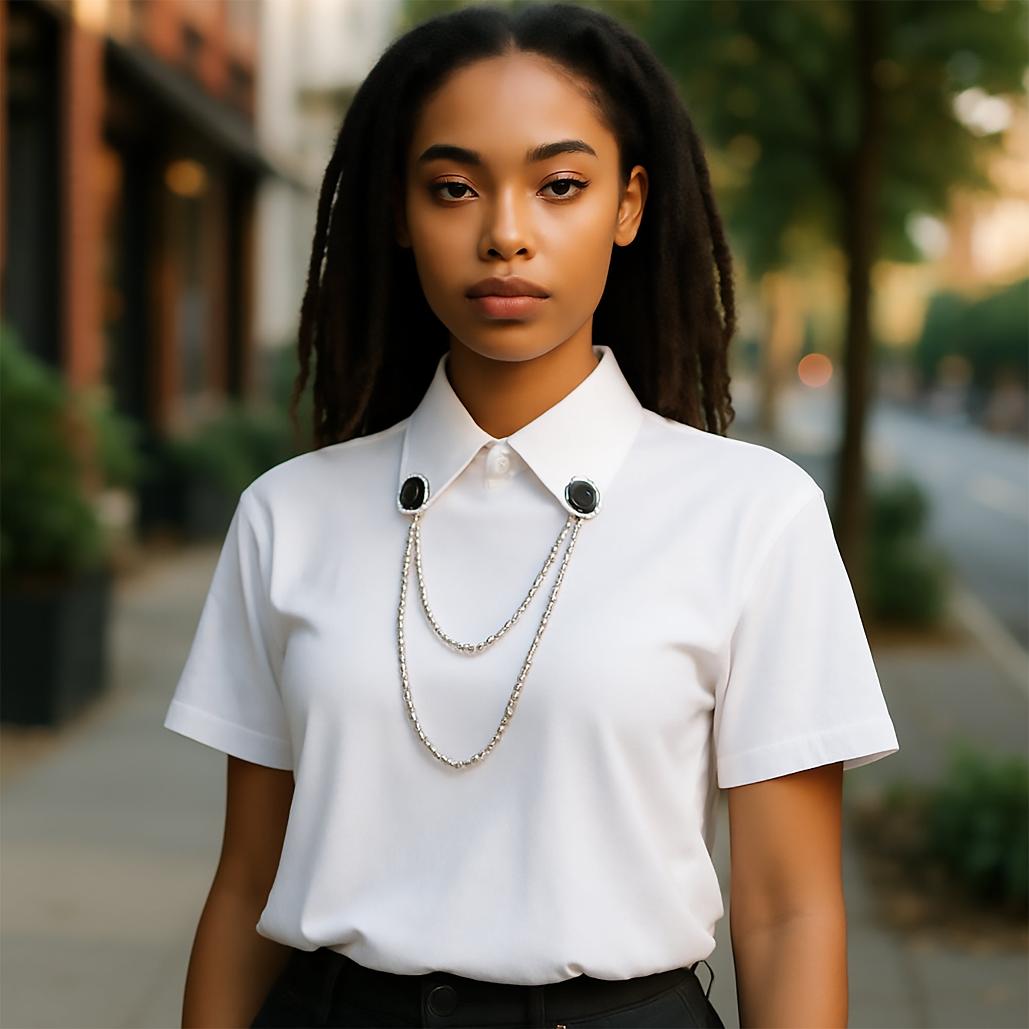 Inspired by Renaissance augulettes, this accessory is a truly versatile statement piece. Shown here as a collar accessory, it can also be worn on any garment in any combination to elevate even the simplest of outfits. The collar is shown with the short version of the necklace brooch. The short version is perfectly sized as an accessory accent, while the extended version is sized to act as a garment accent. For example, wear the large brooch necklace to accent backless necklines or to add some bling to that little black cocktail dress.