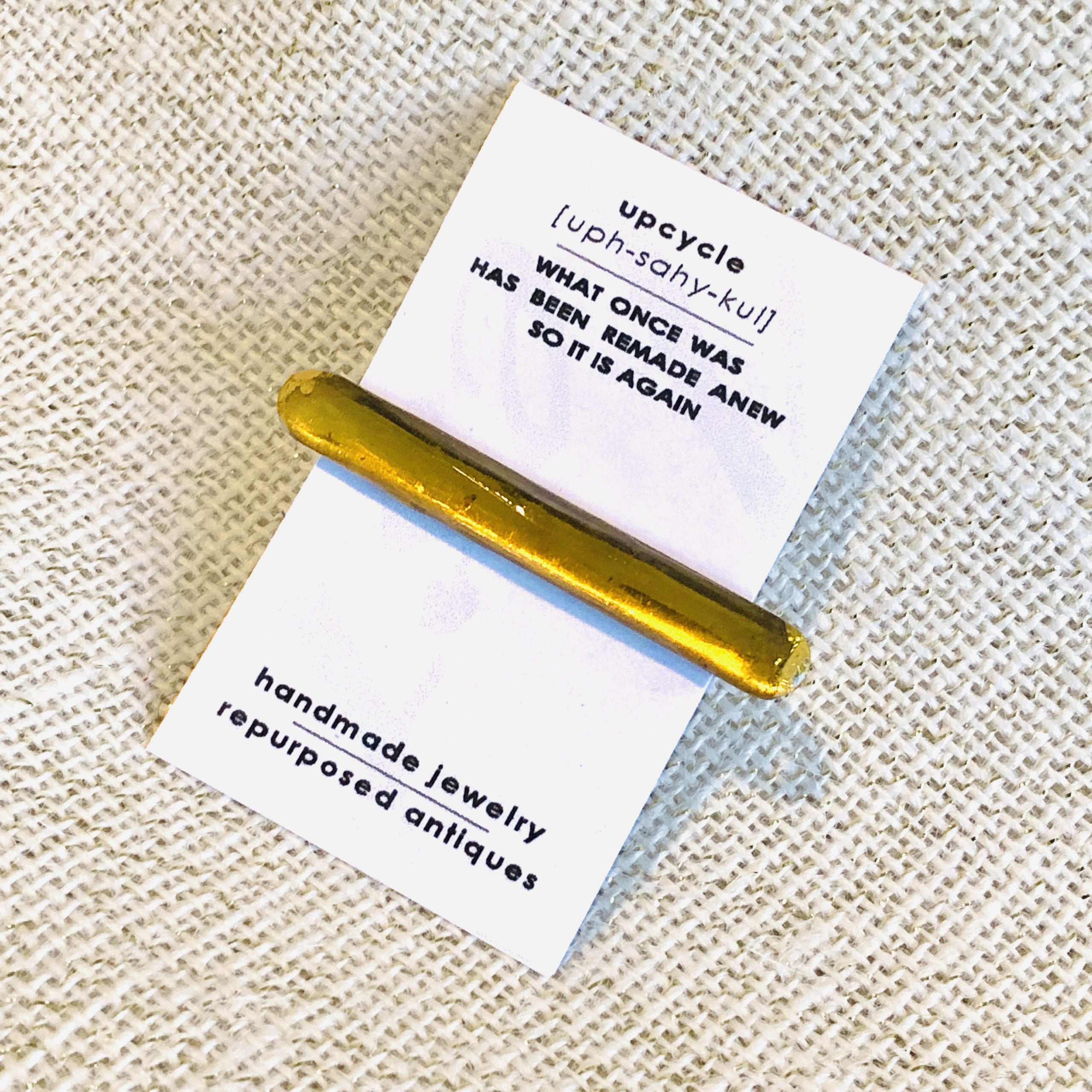 An oblong Art Deco piece of glass has been used to create this upcycled tie bar. The rounded ends lend this piece an air of elegance, while the color and gently aged foil backing make it a truly striking statement—the perfect gift for those who enjoy dressing in suits. The glass, from the 1920s, is now 100 years old!