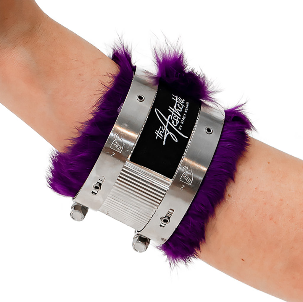 This luxuriously decadent bracelet is a post apocalyptic take on a the classic cuff. The 2 inch wide adjustable metal cuff is reverse lined with rabbit fur and the interior is trimmed in French grossgrain ribbon.