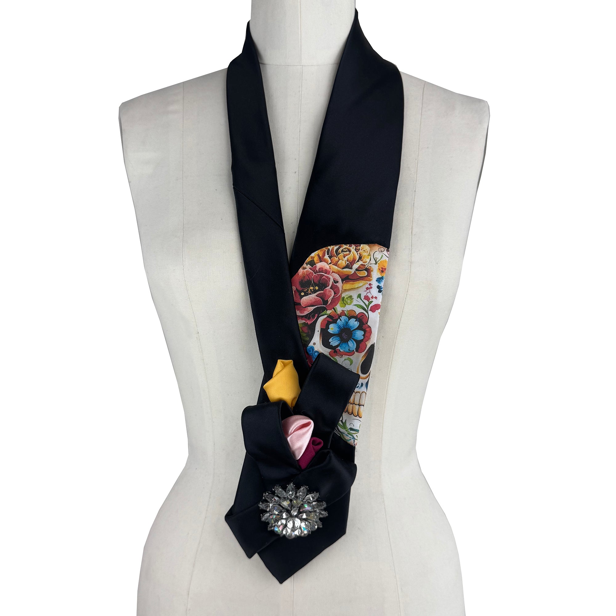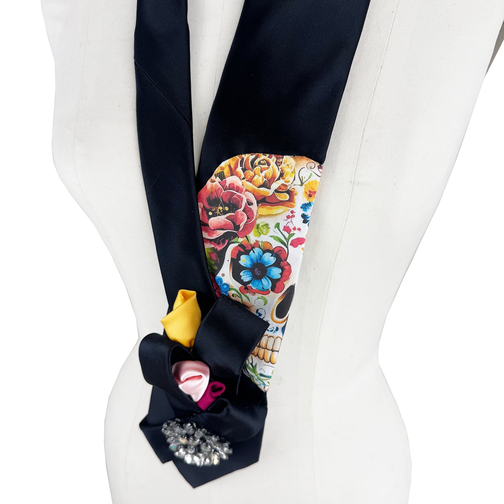Each up-cycled silk tie is a one-of-a-kind statement piece. This silk tie has been hand-formed and decorated with 1980s rhinestone findings and handmade flowers. The floral-filled Day of the Dead (Día de Muertos) skull has been hand-sewn onto the silk tie base. All vintage jewelry findings have been finished to halt the aging process, preserve the current patina, and reduce the risk of losing any additional stones.